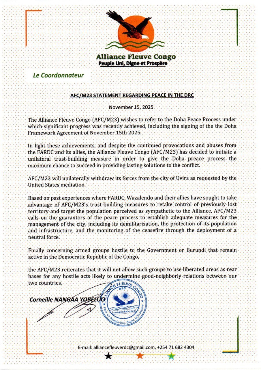 The situation in Uvira remains fluid, and further updates are expected as the withdrawal process unfolds.