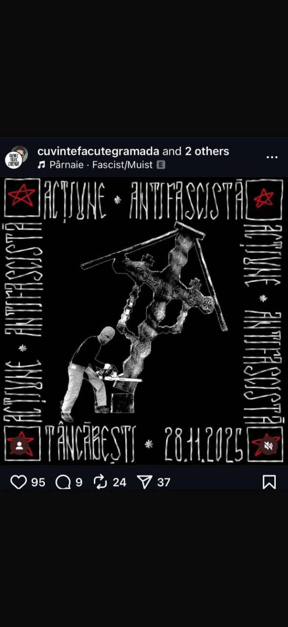 ANTIFA has claimed responsibility for cutting down a cross that commemorated Corneliu Zelea Codreanu and 13 legionnaires who were assassinated on the night between November 29th and November 30th, 1938. The group stated that they performed what they described as the Romanian state"s "job" by removing a "fascist memorial," asserting that crosses are considered fascist memorials.