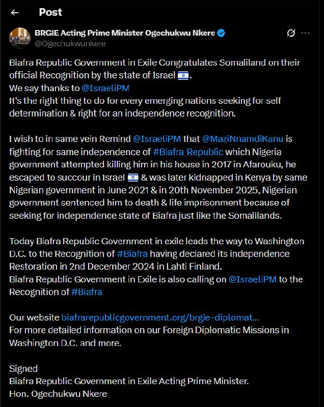 The Biafra Republic Government in Exile, represented by Acting Prime Minister Hon. Ogechukwu Nkere, issued a statement thanking Israeli Prime Minister Netanyahu for recognizing Somaliland. Nkere emphasized that this recognition is a significant step for nations striving for independence and self-determination. He urged Netanyahu to extend similar support to the Biafran cause, highlighting the ongoing struggle for the independence of the Biafra Republic.