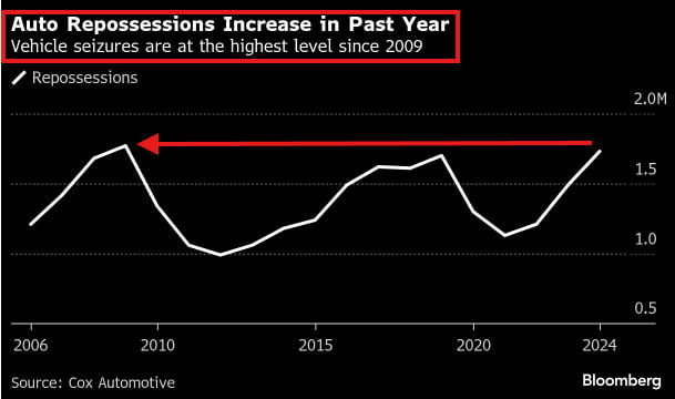 In 2024, car repossessions in the United States reached 1.73 million, marking a 16% increase year-over-year and a 43% rise compared to 2022. This level of repossession is comparable to figures seen in 2009.