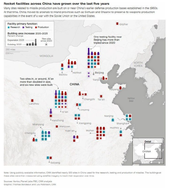 According to a report by CNN, China has expanded over 60% of its missile facilities since 2020, adding approximately 21 million square feet of new structures, which include bunkers and testing sites. This expansion follows a significant increase in missile production that has surged since the invasion of Ukraine. Additionally, China"s nuclear arsenal is reportedly growing by around 100 warheads each year.