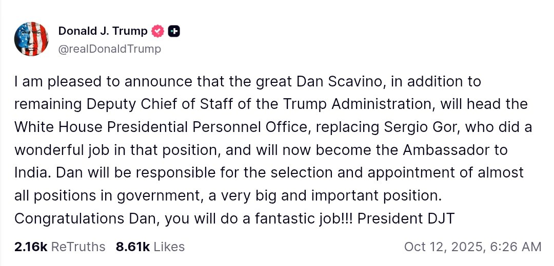 US President Donald Trump announced that Dan Scavino has been appointed to head the White House Presidential Personnel Office. Scavino, who will continue in his role as Deputy Chief of Staff, replaces Sergio Gor in this position. Gor will now serve as the Ambassador to India.