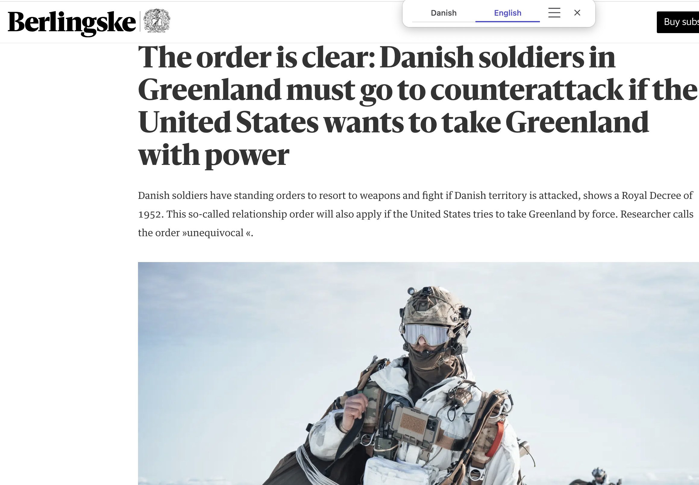 Danish soldiers are under standing orders to engage any hostile activity in Greenland, including unannounced U.S. activity. This standing order, established in 1952, has been confirmed to be in force by both the Danish Defence Command and the Ministry of Defence, according to a report by the news site Berlingske.