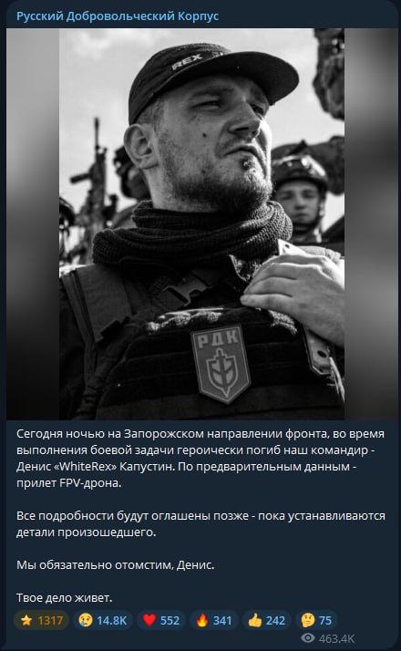 Denis Kapustin, also known by his alias "White Rex," has been confirmed dead following a combat mission in Southern Ukraine. Kapustin served as the commander of the Russian Volunteer Corps (RDK), a far-right paramilitary group that has been actively fighting alongside Ukrainian forces against the Russian military. His death was announced by the RDK through their official Telegram channel, which also expressed intentions of seeking revenge against the Russian government for his killing.