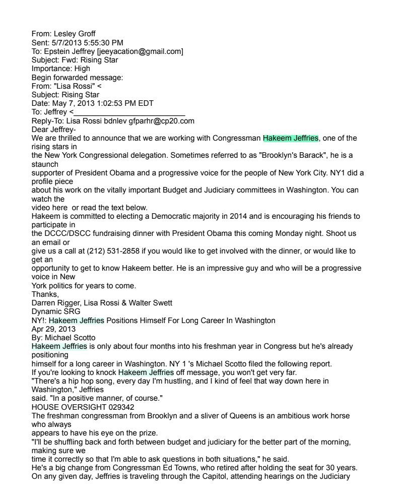 In May 2013, a Democratic fundraising group known as Dynamic SRG sent an email to Jeffrey Epstein, promoting then-freshman Congressman Hakeem Jeffries as a rising political star. The email also extended an invitation to Epstein for a fundraising dinner hosted by the Democratic Congressional Campaign Committee (DCCC) and the Democratic Senatorial Campaign Committee (DSCC), which featured President Obama as a guest.