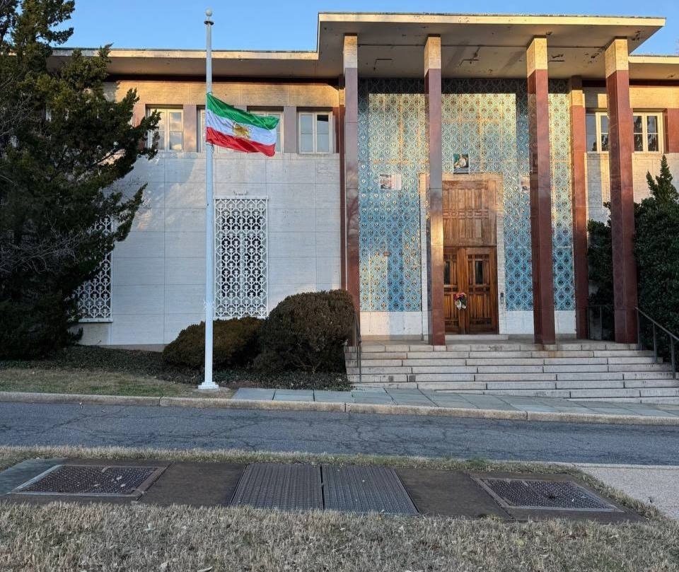 Exiled Iranians and anti-regime activists raised the Lion and Sun flag, Iran"s national banner under the Shah before the 1979 Islamic Revolution, outside the long-abandoned Iranian Embassy building in Washington, D.C. The event took place on Monday, January 12, 2026.