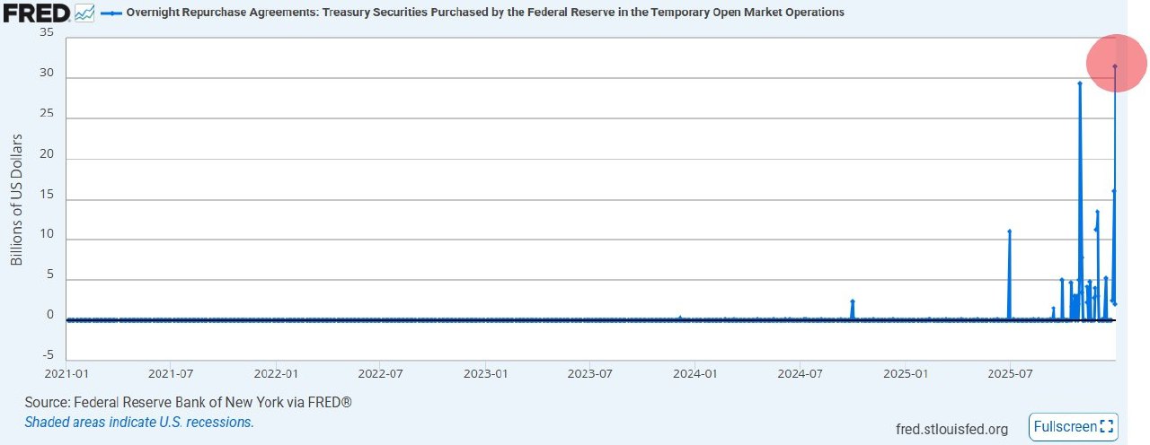 The Federal Reserve has injected $31 billion into the U.S. banking system through overnight repos, marking the largest liquidity injection since the onset of the COVID-19 pandemic. This action surpasses the peak liquidity measures taken during the Dot Com Bubble.