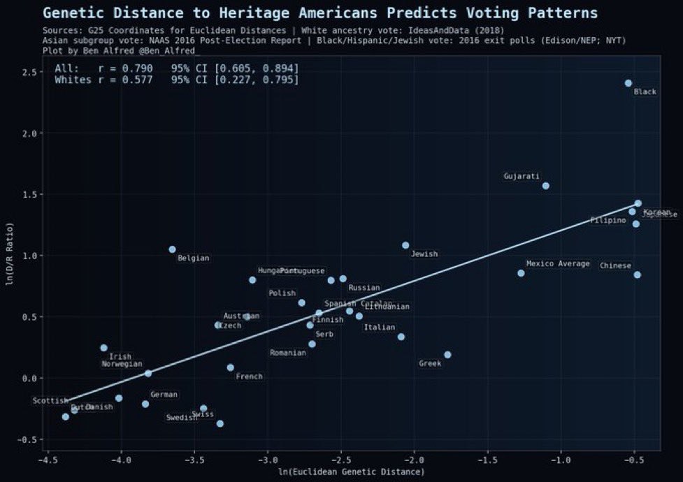 Recent research indicates that genetic distance from America"s "heritage" stock correlates with Democratic voting preferences. The findings suggest a linear relationship, supporting claims made by some groups identifying as "Heritage Americans" who argue that foreigners and immigrants are displacing native populations in the United States.