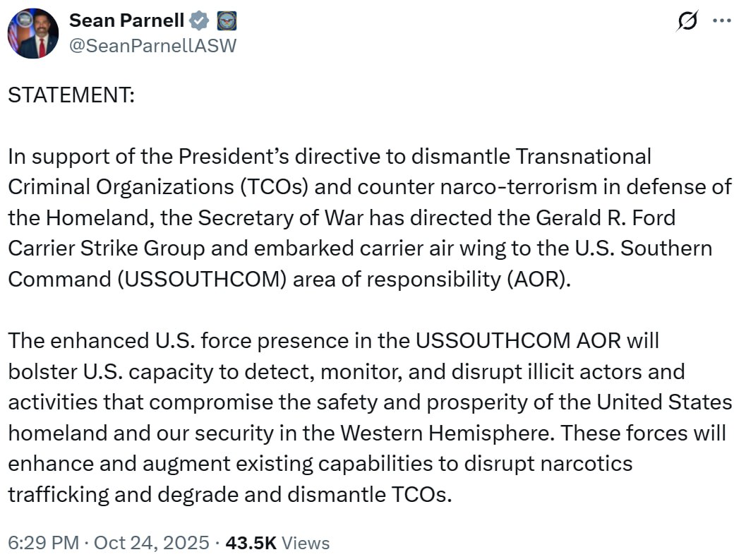 In a recent development, the Gerald R. Ford Carrier Strike Group has been ordered to deploy to the U.S. Southern Command area of responsibility. This decision comes amid ongoing military activities in the region.