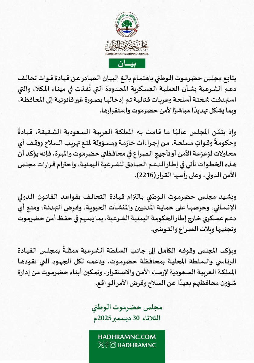 In its statement, the Hadhramaut National Council reaffirmed its commitment to supporting Saudi Arabia"s initiatives aimed at enforcing calm in the region. The Council highlighted the importance of preventing further escalation of conflict and ensuring the security and stability of Hadhramaut and its inhabitants. This stance reflects a broader strategy to maintain peace and order in a region that has been significantly affected by the ongoing civil war in Yemen.