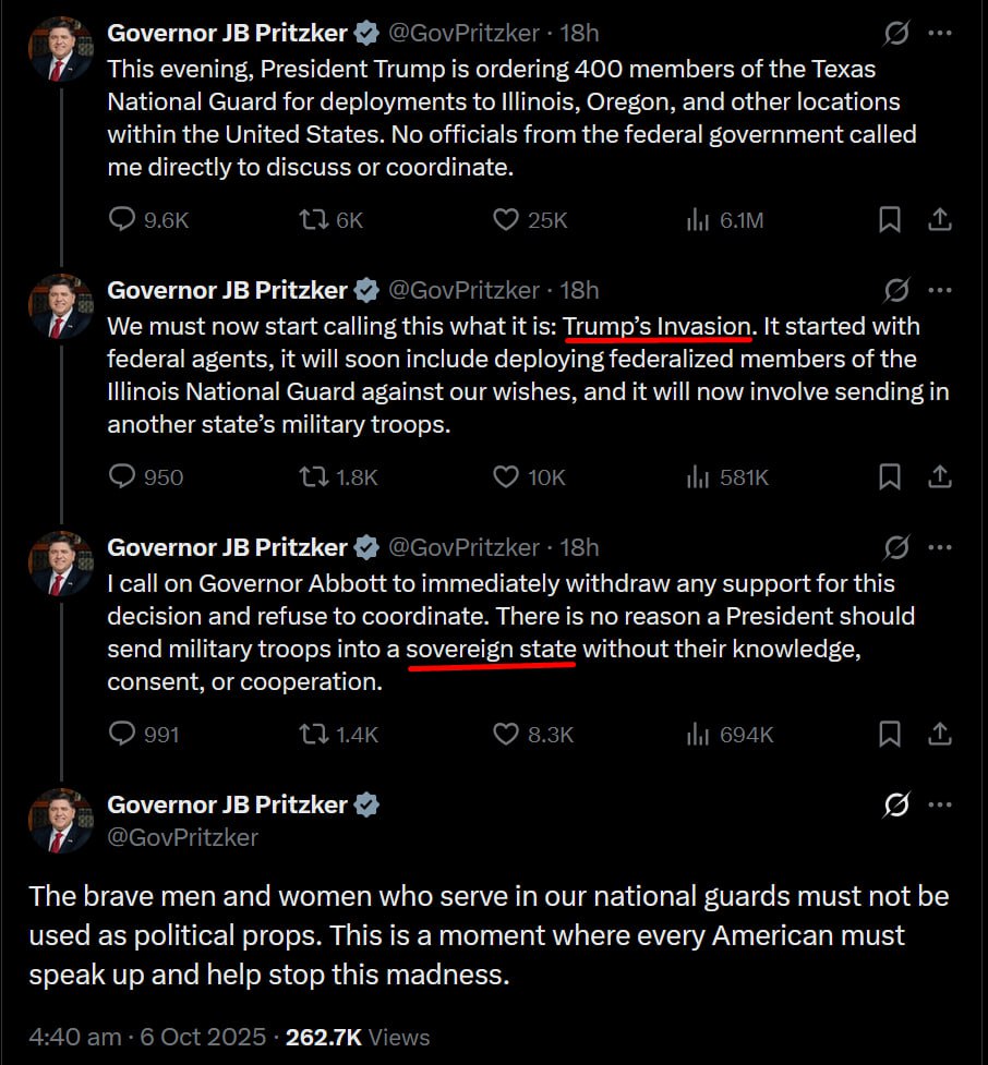 Illinois Governor Jay Robert "JB" Pritzker criticized U.S. President Donald Trump"s decision to deploy elements of the National Guard from Texas to Illinois and Oregon, calling it an "invasion." In a series of tweets, Pritzker emphasized that Illinois is a "sovereign state." He also urged National Guardsmen to disobey orders from federal authorities.