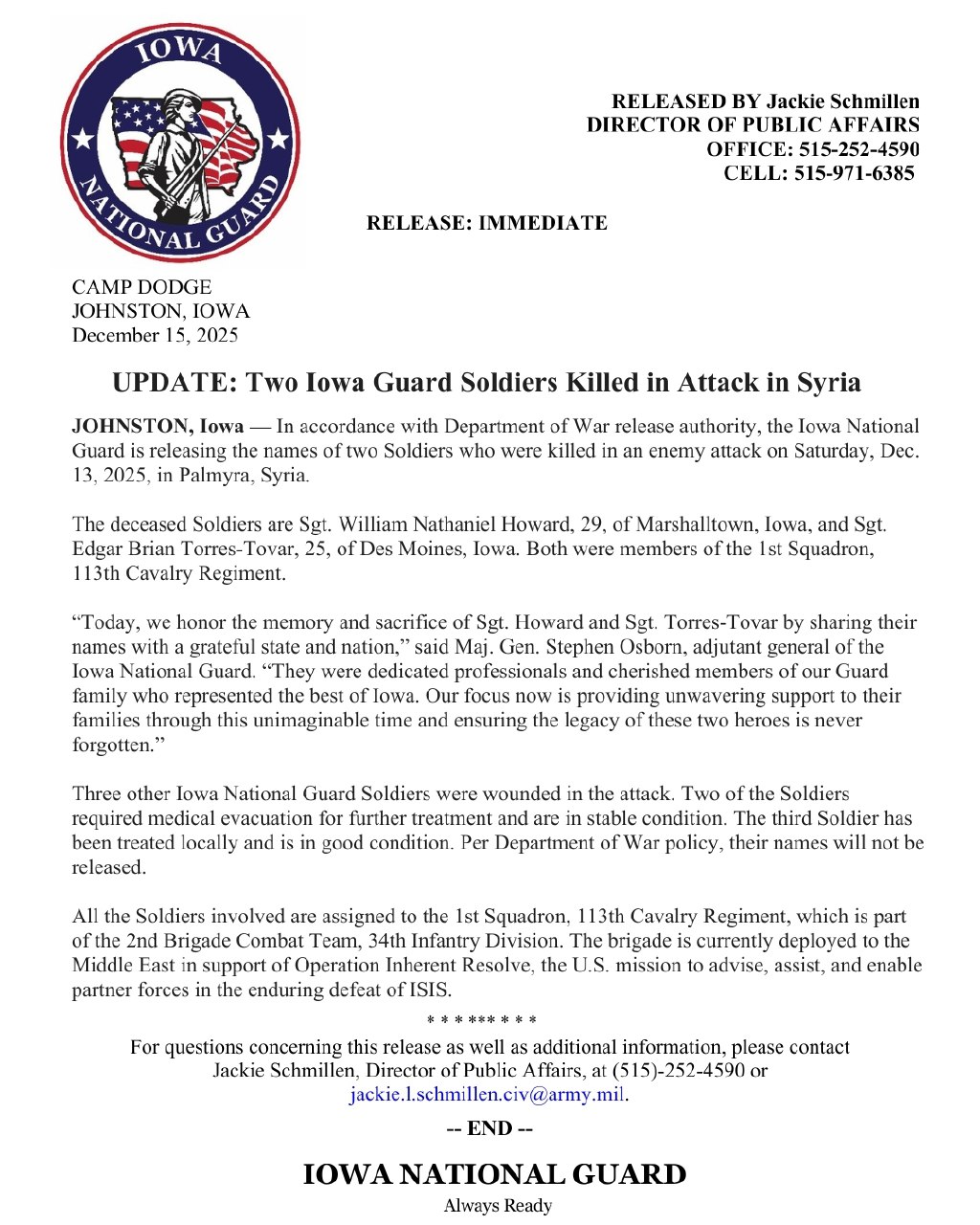 The Iowa National Guard, under the authority of the Department of War, released the names of the deceased soldiers in a statement aimed at honoring their sacrifice and informing the public. Major General Stephen Osborn, the adjutant general of the Iowa National Guard, expressed profound sorrow and respect for the fallen soldiers. He stated, "Today, we honor the memory and sacrifice of Sgt. Howard and Sgt. Torres-Tovar by sharing their names with a grateful state and nation. They were dedicated professionals and cherished members of our Guard family who represented the best of Iowa." This statement highlights the commitment of the National Guard to support the families of the deceased during this difficult time.