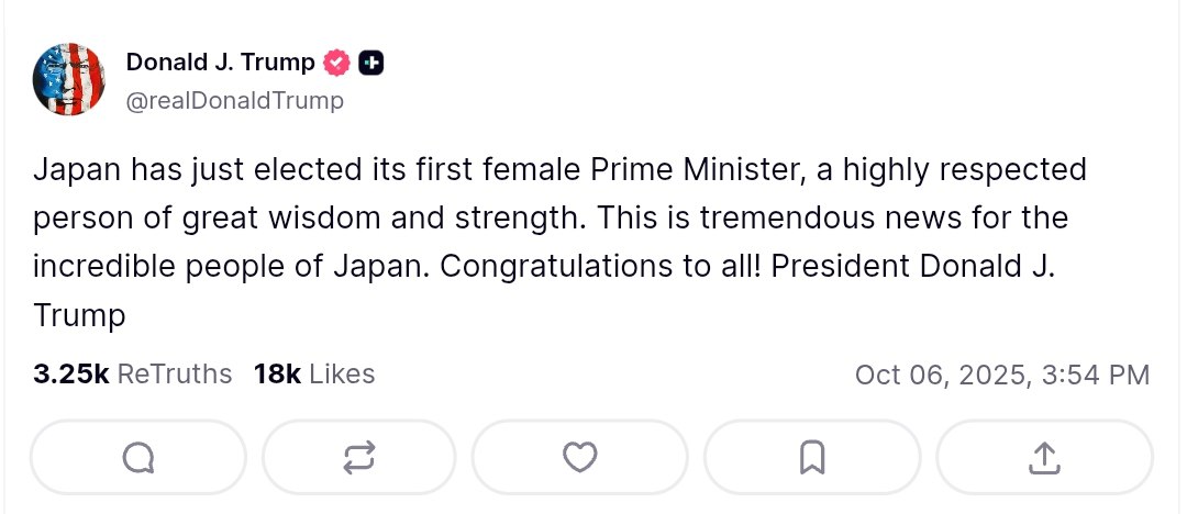 #BREAKING | US President Donald Trump announced that Japan has elected its first female Prime Minister. He described her as a highly respected person of great wisdom and strength. President Trump expressed that this is tremendous news for the people of Japan and extended his congratulations to all involved.