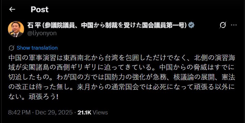 Hirai, who was born Shi Ping in Sichuan Province, China, and is currently sanctioned by the People"s Republic of China (PRC) for his outspoken criticism of the Chinese Communist Party (CCP), emphasized the urgency of strengthening Japan"s national defense. He specifically pointed to the PLA"s military exercises, which have not only surrounded Taiwan from multiple directions—east, west, south, and north—but have also encroached upon the western edge of the Senkaku Islands, a territory claimed by both Japan and China.
