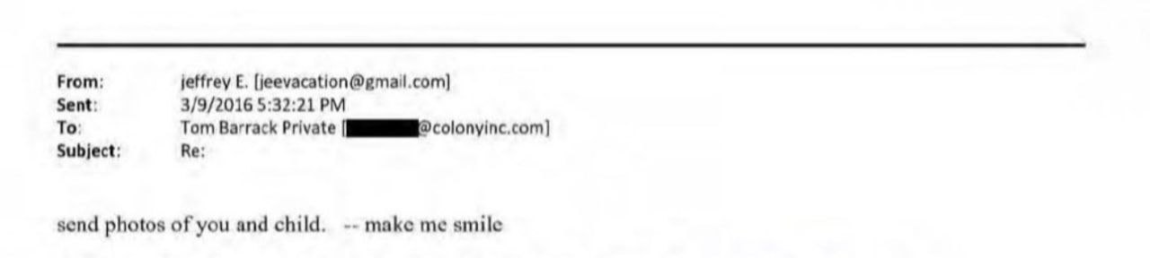 Jeffrey Epstein, the convicted sex offender, requested photographs from Tom Barrack, the U.S. Special Envoy to Syria, in a message that read, "Send photos of you and child, make me smile." This communication highlights Epstein"s ongoing interactions with high-profile individuals.