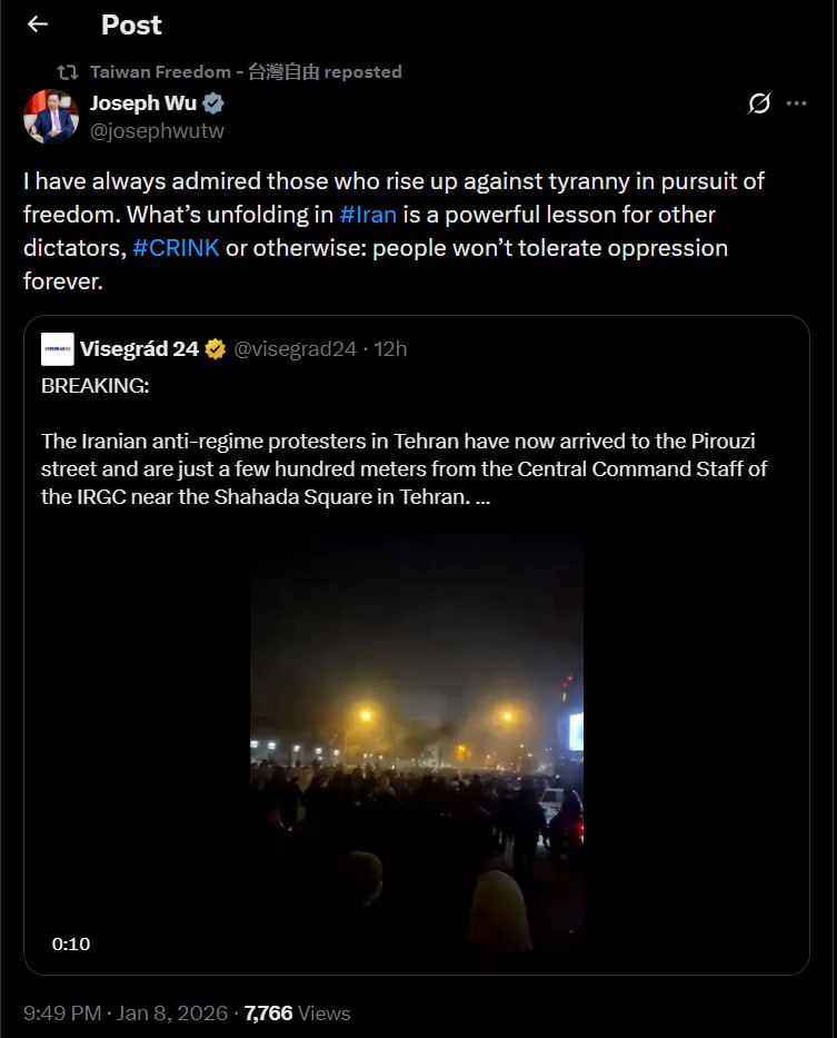 Joseph Wu, the Secretary-General of the National Security Council of the Republic of China (Taiwan), has expressed support for the ongoing anti-regime protests in Iran. Wu stated that he admires those who rise against tyranny in their pursuit of freedom.