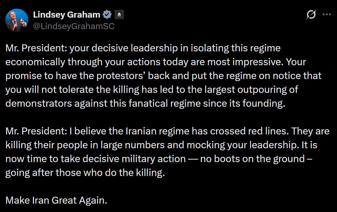 On January 12, 2026, Republican Senator Lindsey Graham expressed strong support for U.S. President Joe Biden"s recent actions aimed at economically isolating the Iranian regime. Graham"s statement highlighted the significant protests erupting in Iran, which he described as the largest since the regime"s inception. He urged the President to take decisive military action against the Iranian government, emphasizing the need to protect the Iranian people from violence perpetrated by their own government.