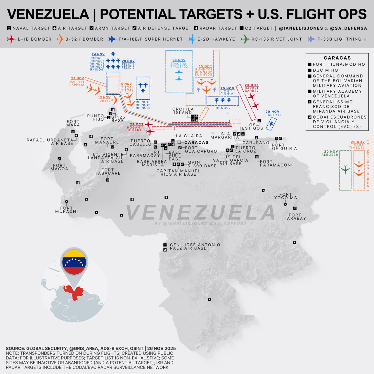 A modified map detailing potential military targets in Venezuela has been released, showing an overlay of U.S. flight operations in the region. The map indicates that there were seven bomber attack demonstrations originating from the continental United States, which included four B-1B bombers and ten B-52H bombers.