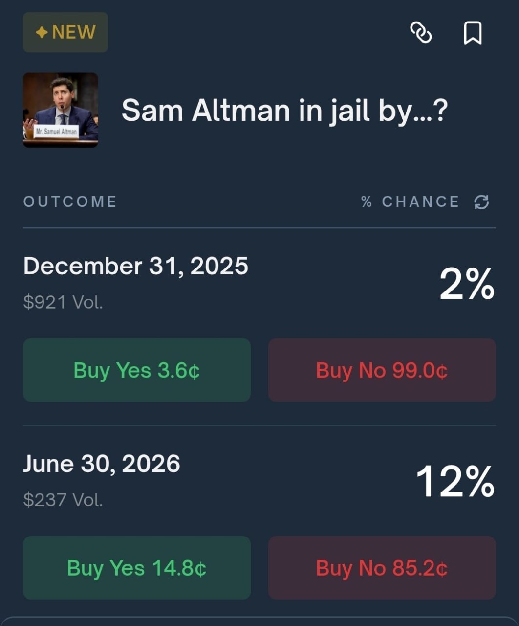 A new prediction from Polymarket suggests that Sam Altman, CEO of OpenAI, may face jail time by June 30, 2026. The platform has provided two potential dates for this outcome: December 31, 2025, and June 30, 2026.