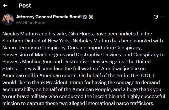 US Attorney General Pamela Bondi announced that Nicolás Maduro and his wife, Cilia Flores, have been indicted in the Southern District of New York. Maduro faces multiple charges, including conspiracy to commit narco-terrorism, conspiracy to import cocaine, possession of automatic weapons and destructive devices, and conspiracy to possess automatic weapons and destructive devices against the United States.