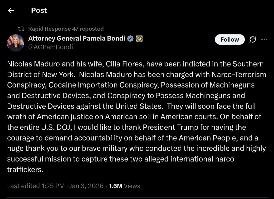 Attorney General Bondi expressed gratitude to President Trump for his commitment to seeking accountability on behalf of the American people. She also acknowledged the efforts of the U.S. military, which she credited with conducting a successful mission to capture the two individuals, who are described as alleged international narco-traffickers.