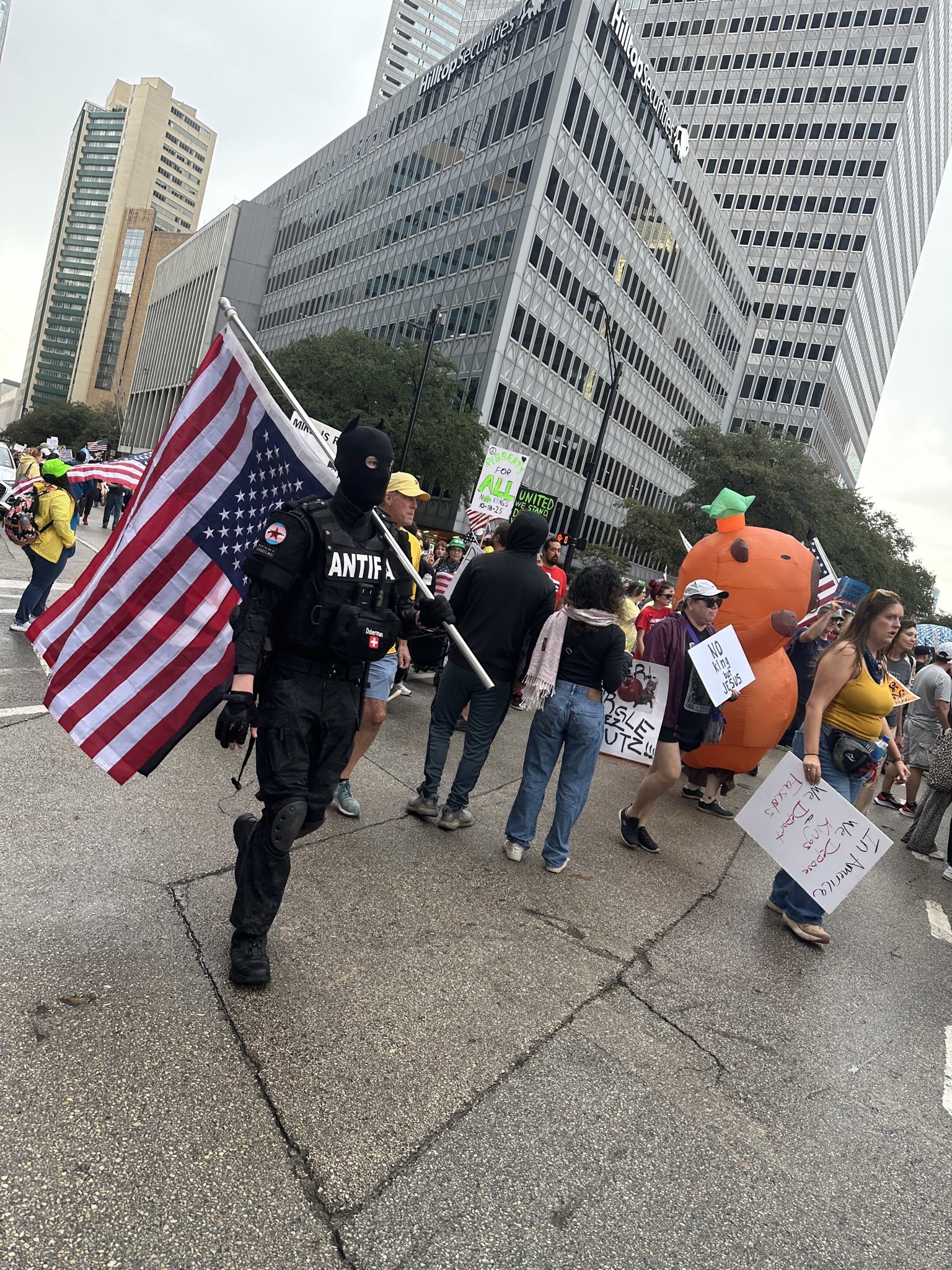 BREAKING: No protesters at the No Kings event were observed wearing Antifa shirts or carrying an upside-down American flag. The event took place on Saturday, October 18, 2025.