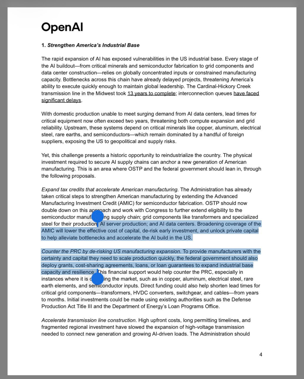 OpenAI has submitted a document advocating for the inclusion of datacenter spending within the "American manufacturing" category. This document was submitted one week ago and specifically calls for federal loan guarantees to support this initiative.
