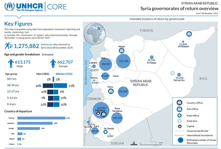 One year after the fall of President Bashar al-Assad, over 3.2 million Syrians have returned to their home country. The provincial distribution of these returnees includes 1.3 million refugees, with the majority coming from three host countries.