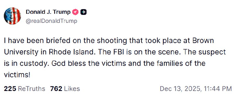 President Donald Trump announced via Truth Social that he has been briefed on a shooting incident that occurred at Brown University in Rhode Island. According to Trump, the FBI is currently on the scene, and the suspect involved in the shooting is in custody. Trump expressed his condolences, stating, "God bless the victims and the families of the victims."