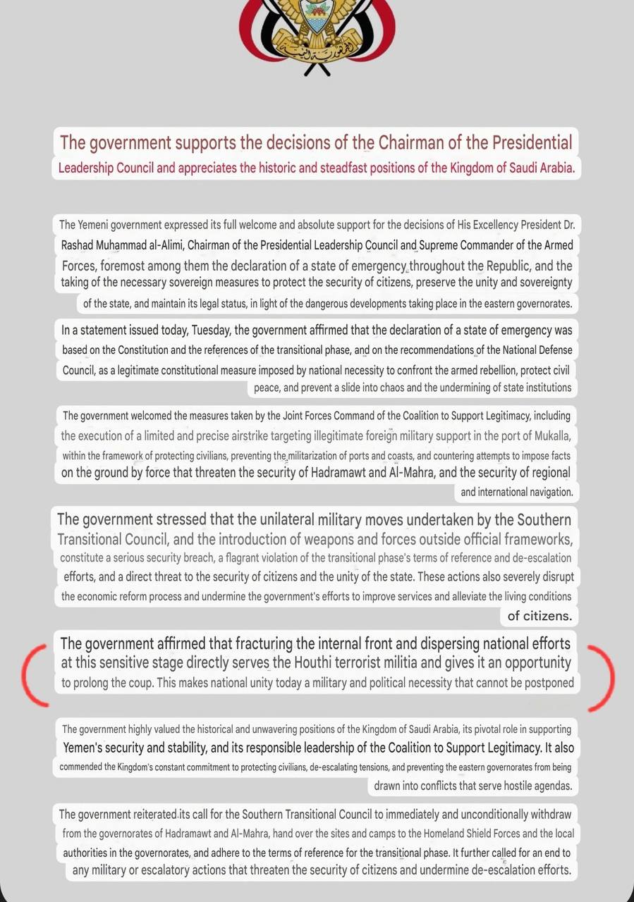 The government of Aden issued a statement addressing the situation, highlighting several critical points regarding the actions of the Southern Transitional Council (STC), a prominent UAE-backed group. The statement characterized the unilateral military operations conducted by the STC as a serious security breach. It condemned the introduction of weapons and forces outside of official military frameworks, labeling these actions as a flagrant violation of the terms of reference established for the transitional phase in Yemen.