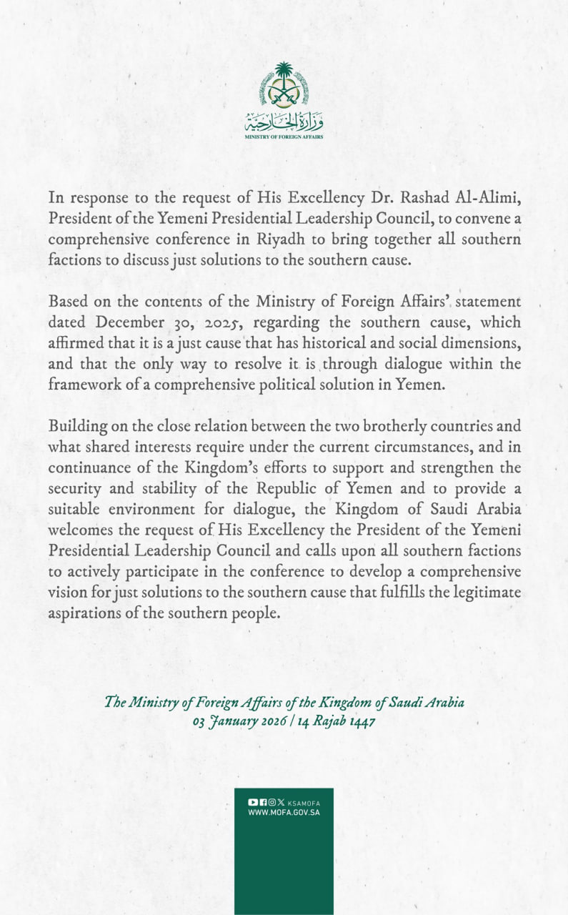 On January 2, 2026, Saudi Arabia announced its intention to host a comprehensive conference in Riyadh aimed at uniting various southern Yemeni factions. This initiative follows a formal request from Rashad Al-Alimi, the President of the Yemeni Presidential Leadership Council. The conference is designed to foster dialogue among the southern groups and develop a unified vision that addresses the legitimate aspirations of the southern Yemeni population.