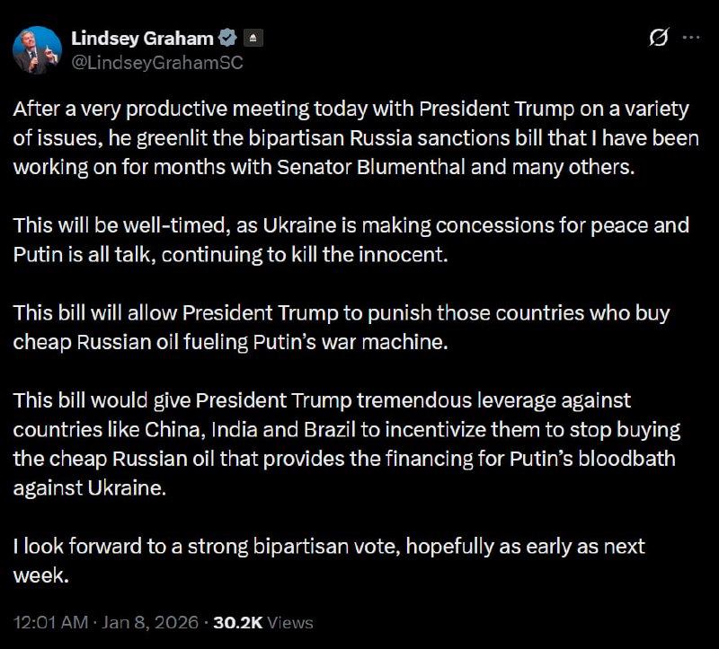 On January 7, 2026, Republican Senator Lindsey Graham announced that former President Donald Trump has approved a bipartisan sanctions bill aimed at penalizing countries that continue to purchase Russian oil. This legislation, which Graham has collaborated on for several months with Democratic Senator Richard Blumenthal and other lawmakers, is designed to provide the U.S. government with the authority to impose sanctions on nations that support Russia"s military operations through their oil purchases.