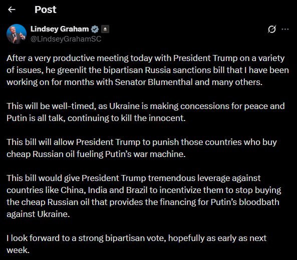 Graham stated, "This bill will allow President Trump to punish those countries who buy cheap Russian oil fueling Putin’s war machine." He expressed optimism about the bill"s prospects, indicating that he anticipates a strong bipartisan vote in Congress, potentially as early as next week. The bipartisan nature of the bill reflects a growing consensus among U.S. lawmakers regarding the need to take decisive action against nations that contribute to the financing of the conflict in Ukraine through their oil purchases.