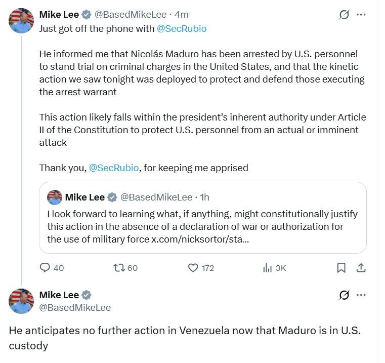 U.S. Senator Mike Lee announced that U.S. Secretary of State Marco Rubio informed him that Venezuelan leader Nicolás Maduro has been captured by U.S. personnel and will stand trial on criminal charges in the United States.