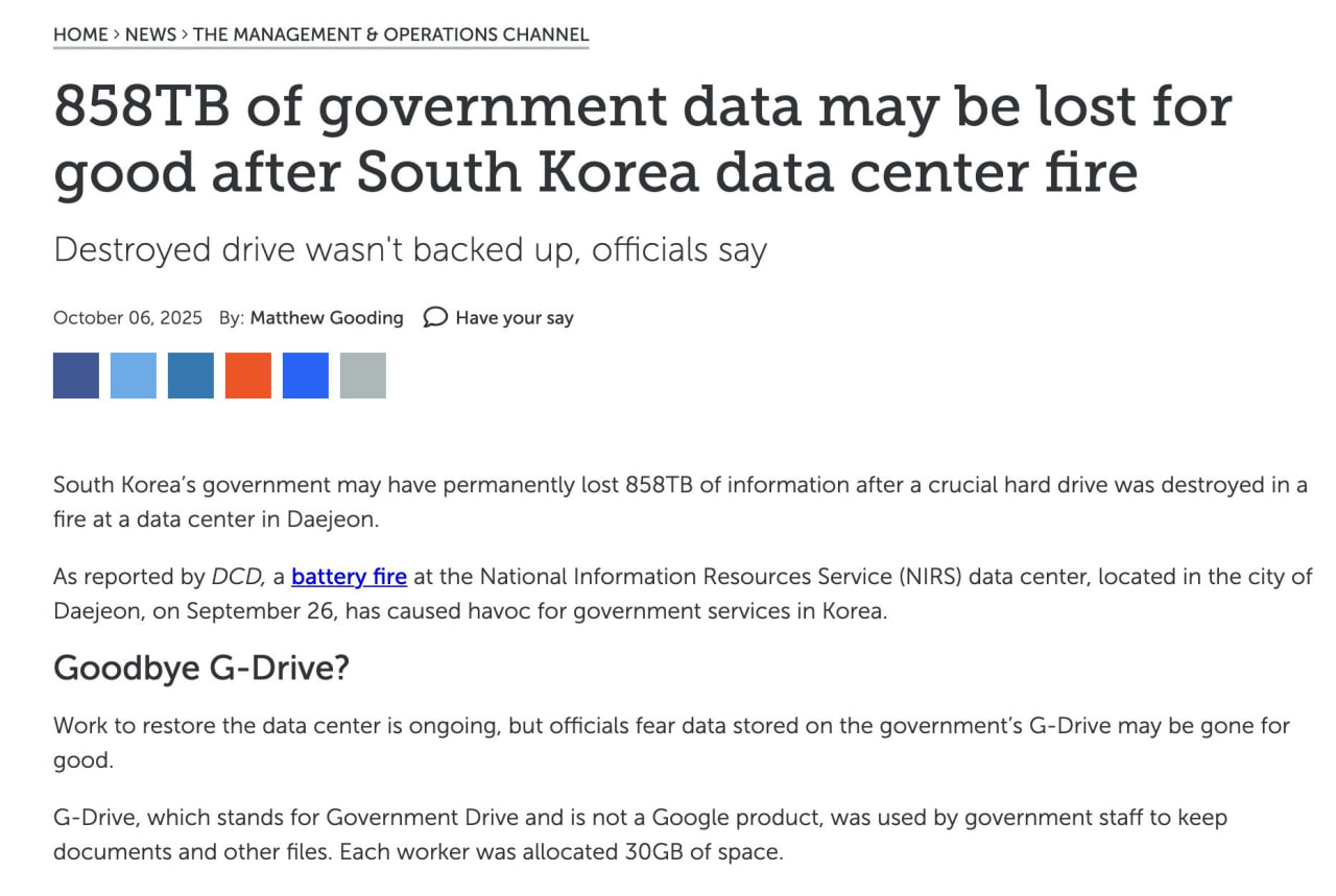 The South Korean government has lost all of its data after consolidating all of its servers in one physical location without any backup systems in place. The G-Drive, which housed the data, was unable to implement a backup system due to its large capacity.