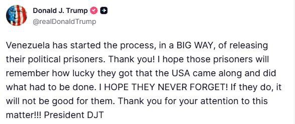 US President Donald Trump announced that Venezuela has begun the process of releasing its political prisoners. In a statement, Trump expressed gratitude for this development and emphasized that he hopes the released prisoners will remember the role of the United States in facilitating this change. He stated, "I HOPE THEY NEVER FORGET! If they do, it will not be good for them."