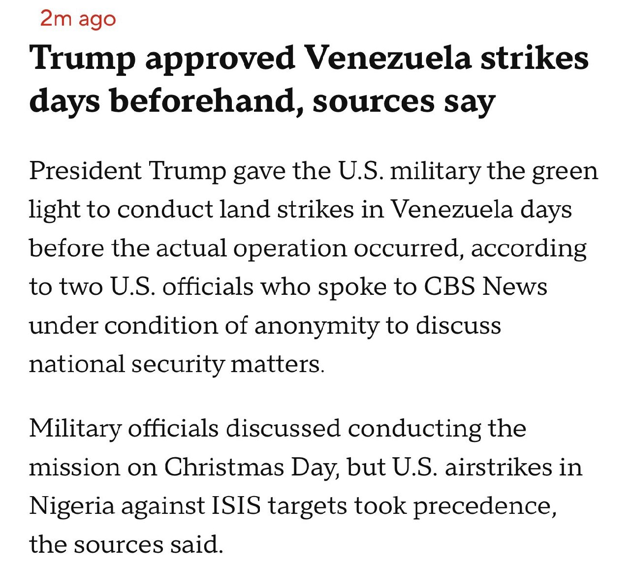 U.S. President Donald J. Trump authorized the Pentagon to conduct land strikes in Venezuela just days before the operation took place, according to two U.S. officials who spoke to CBS News. The discussions regarding the mission included plans to execute it on Christmas Day. However, airstrikes targeting ISIS positions in Nigeria took precedence over the Venezuela operation.