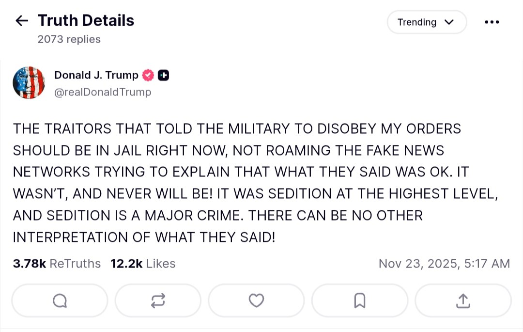 US President Donald Trump has publicly called for military officials who allegedly disobeyed his orders to be jailed. In a statement, Trump expressed his belief that these individuals should not be allowed to "roam the fake news networks" attempting to justify their actions. He characterized their behavior as "sedition at the highest level," asserting that it constitutes a major crime. Trump emphasized that there can be "no other interpretation" of their actions.