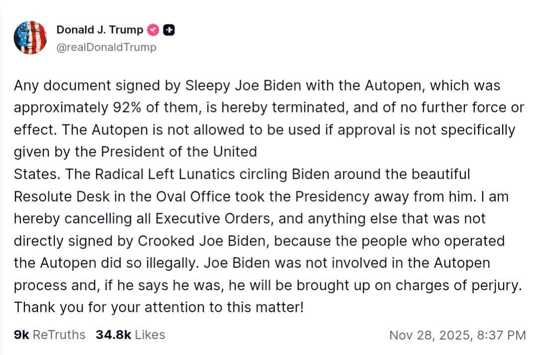 On November 28, 2025, former U.S. President Donald Trump announced a significant decision regarding the executive orders signed by current President Joe Biden. In a statement, Trump declared that any document signed by Biden using an autopen, which he claims constitutes approximately 92% of all such documents, is "hereby terminated, and of no further force or effect." This announcement raises questions about the legality of Biden"s use of the autopen and its implications for his administration"s policies.