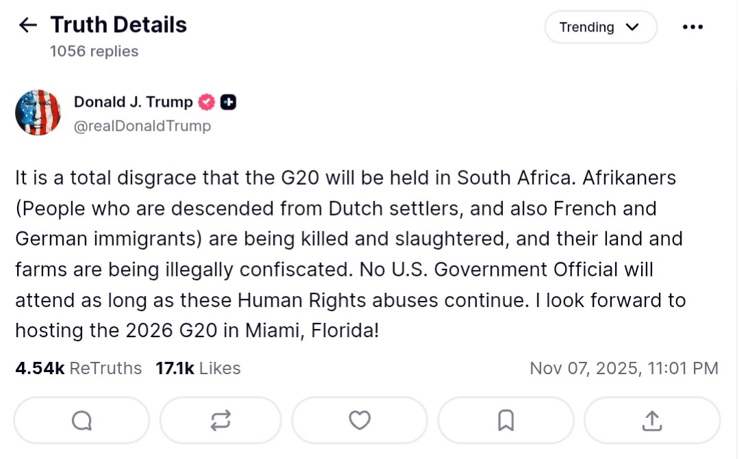 Trump announced that no U.S. government officials would attend the G20 summit as long as these alleged human rights violations continue. He expressed his intention to host the G20 in Miami, Florida, in 2026.