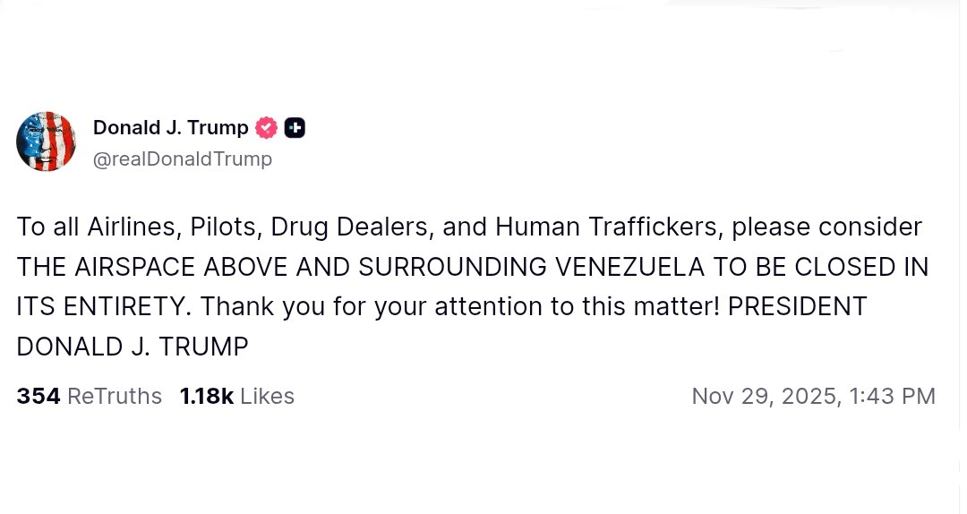 US President Donald Trump has declared that the airspace above and surrounding Venezuela is closed to all airlines, pilots, drug dealers, and human traffickers. This announcement was made on Saturday, November 29, 2025.
