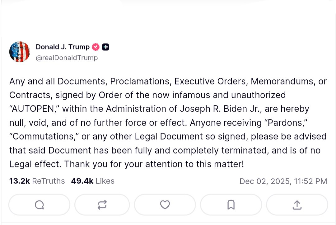 In a significant political move, former U.S. President Donald J. Trump has announced that any documents, proclamations, executive orders, memorandums, or contracts signed by the now infamous "AUTOPEN" during the administration of President Joseph R. Biden Jr. are declared null, void, and of no further force or effect. This declaration raises questions about the legitimacy of various legal documents issued under the Biden administration, particularly those that may have granted pardons or commutations.