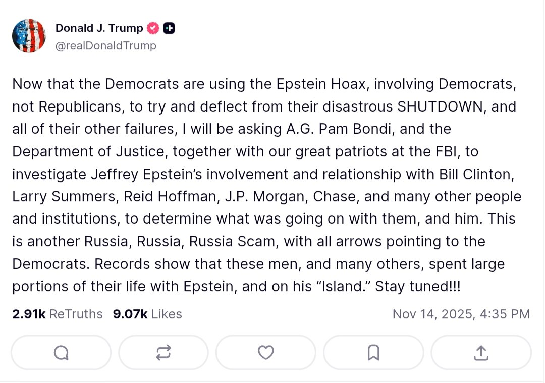 US President Donald Trump announced on Friday, November 14, 2025, that he will direct Attorney General Pam Bondi and the Department of Justice (DOJ), along with the FBI, to investigate Jeffrey Epstein’s connections to several prominent figures, including former President Bill Clinton, former Treasury Secretary Larry Summers, LinkedIn co-founder Reid Hoffman, and JPMorgan Chase.