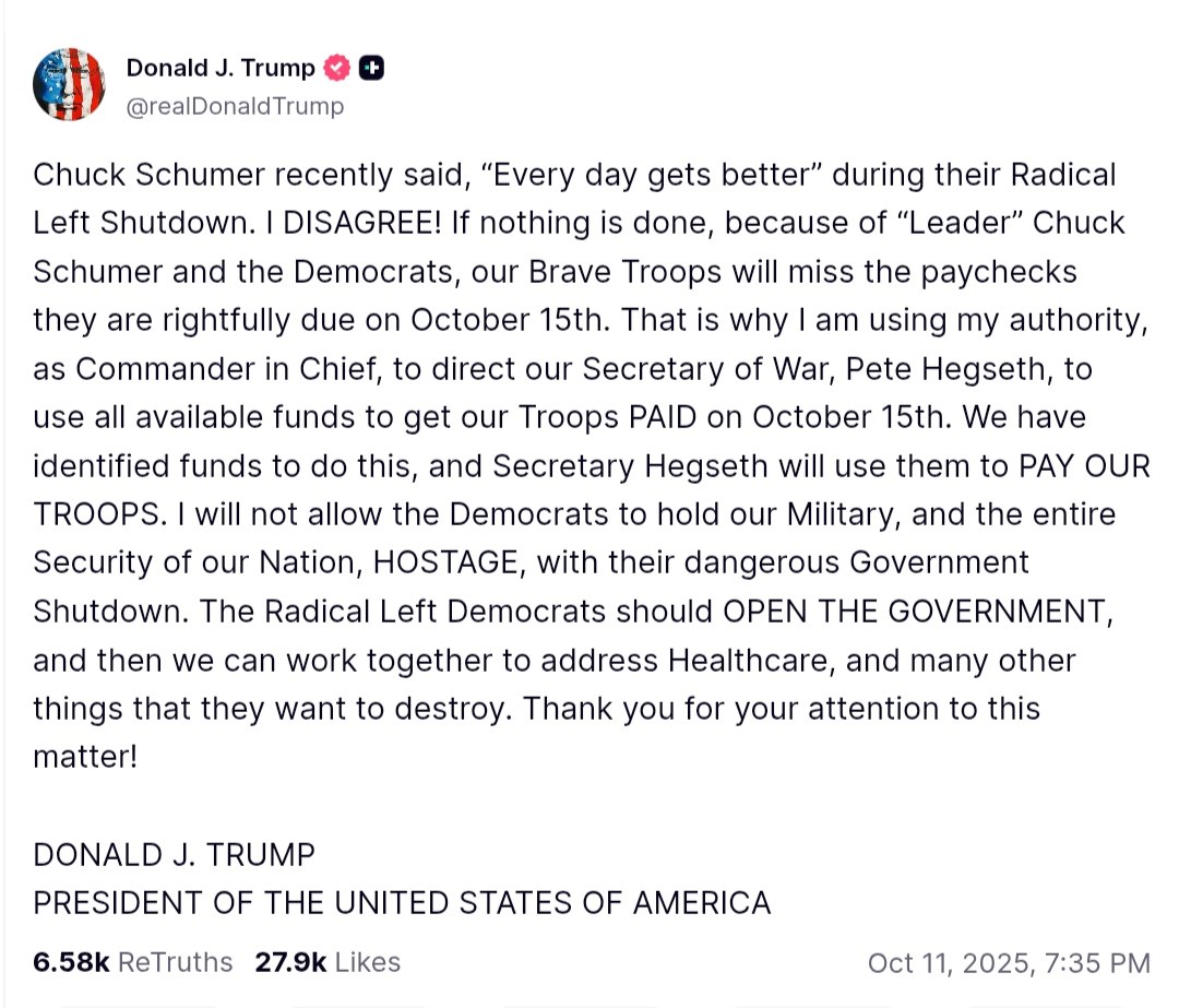 Trump stated he is using his authority as Commander-in-Chief to direct Secretary of War Pete Hegseth to reallocate available funds for military pay. He emphasized, "I will not allow the Democrats to hold our Military... HOSTAGE." This statement comes in response to Senate Majority Leader Chuck Schumer"s assertion that "Every day gets better" during the impasse, which threatens to delay pay for approximately 1.3 million service members.