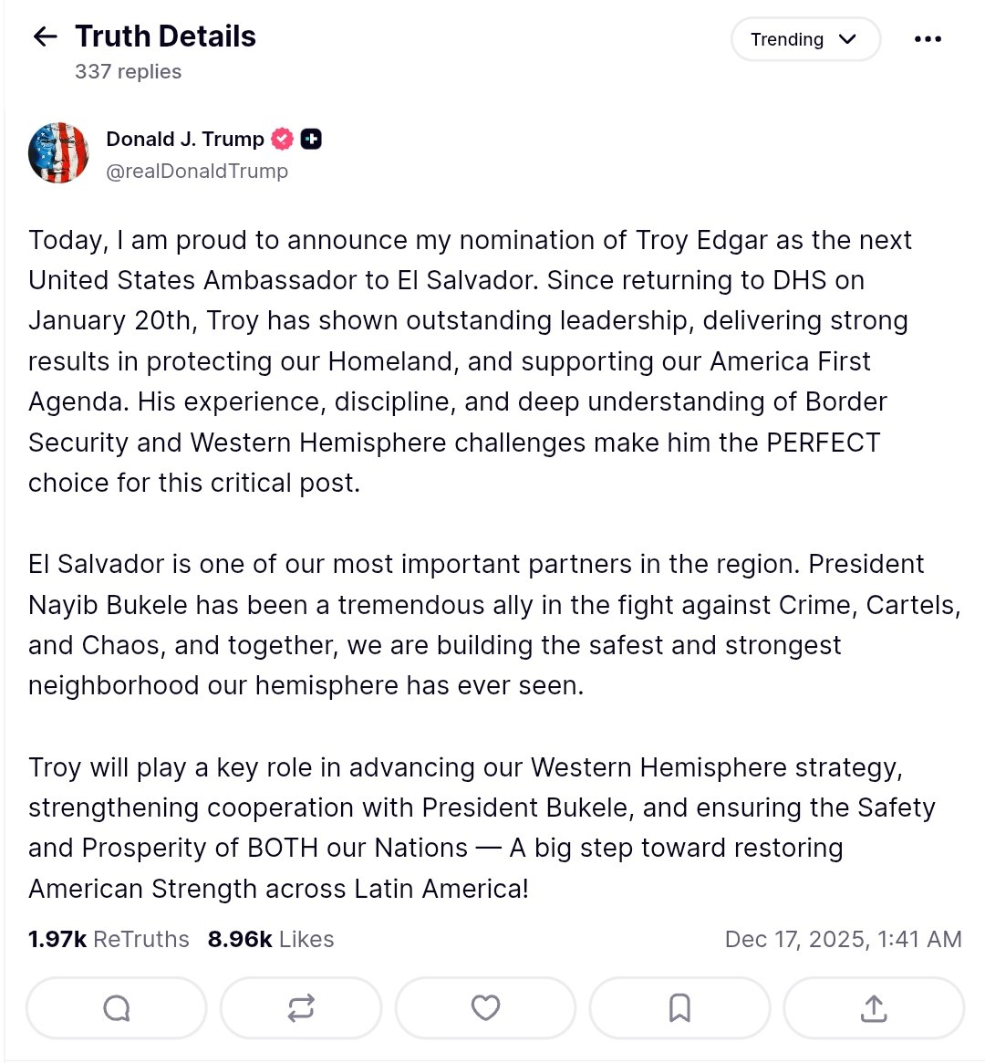 US President Donald Trump has appointed Troy Edgar as the next United States Ambassador to El Salvador. This announcement was made on December 17, 2025.