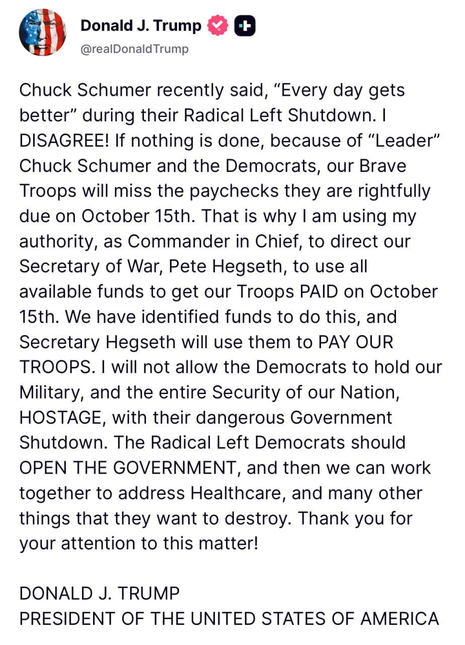 President Trump has ordered Secretary of War Pete Hegseth to utilize all available funds to ensure that U.S. service members are paid on October 15. Trump stated that he "will not allow the Democrats" to hold America"s security "hostage" amid the ongoing government shutdown.