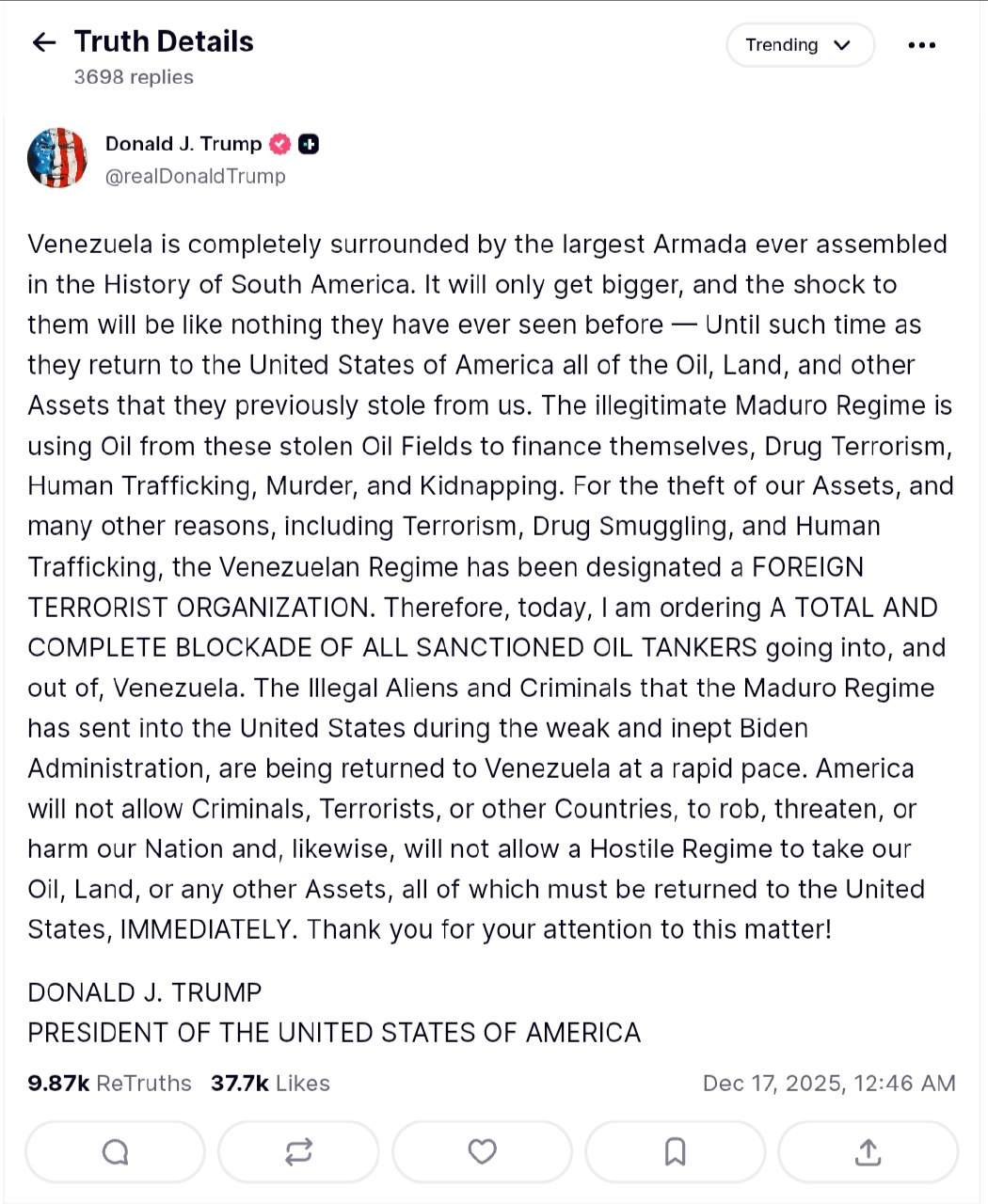 US President Donald Trump has ordered a "total and complete blockade of all sanctioned oil tankers going into, and out of, Venezuela." This directive was announced on December 17, 2025.