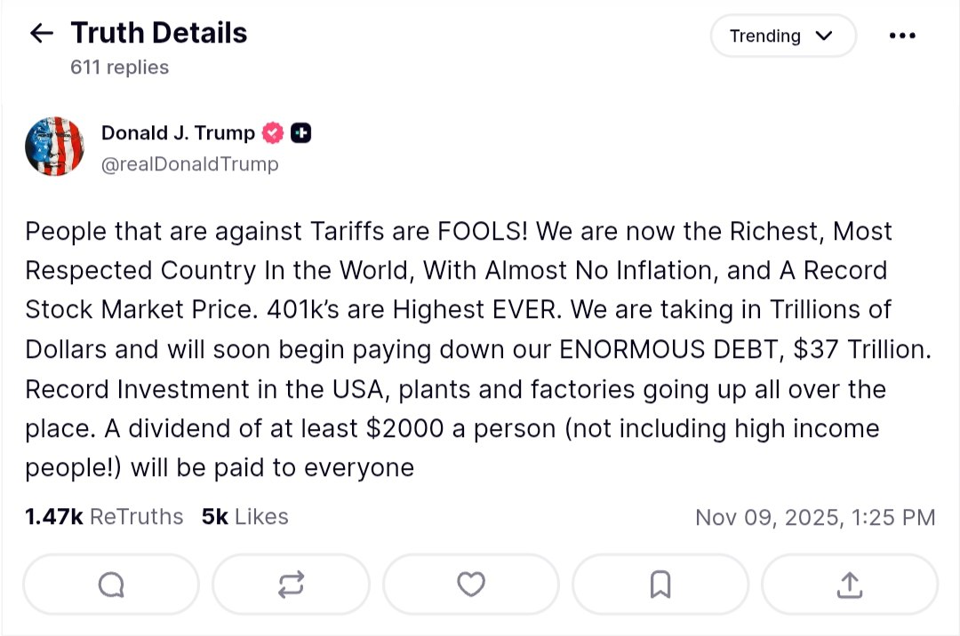 US President Donald Trump has announced a pledge to provide a dividend of at least $2,000 to every individual, excluding high-income earners. This statement was made on Sunday, November 9, 2025.