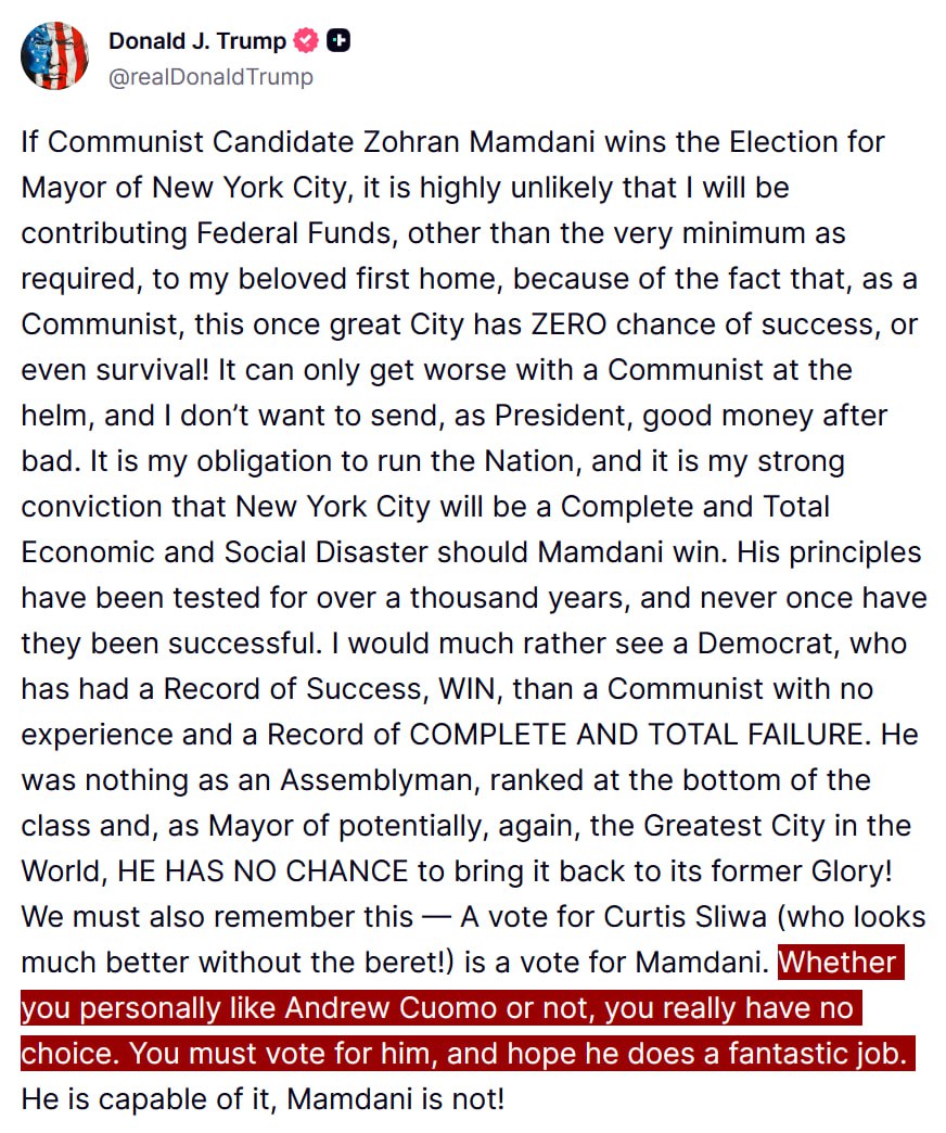 Former President Donald Trump has reaffirmed his endorsement of Andrew Cuomo in the upcoming New York City mayoral race. Trump stated, "You must vote for him," emphasizing his support for Cuomo"s candidacy.