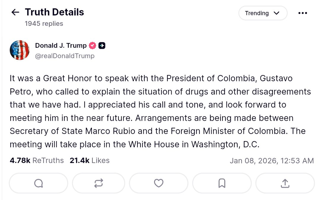 On January 8, 2026, U.S. President Donald Trump announced that he had a productive conversation with Colombian President Gustavo Petro regarding pressing issues related to drug trafficking and other disagreements between the two nations. The call, which Trump described as a "Great Honor," is seen as a significant step in addressing the ongoing challenges posed by drug-related violence and trade in Colombia, a country historically known for its production of cocaine and other narcotics.
